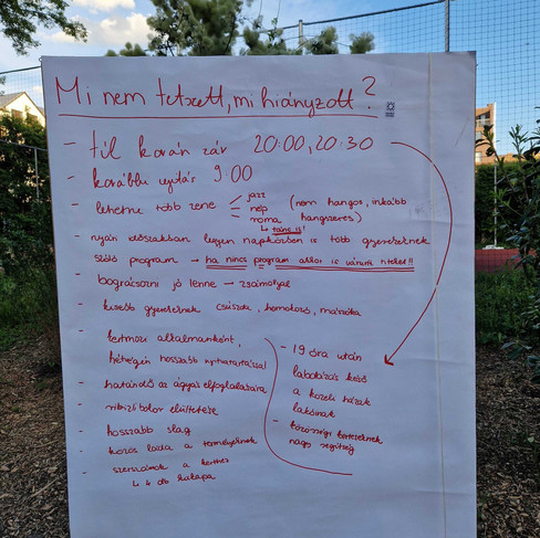 Arra, hogy mi tetszett leginkább olyan válaszok érkeztek, hogy az udvar tiszta, nagyon jó programok vannak a kisebbeknek és nagyobbaknak is, szívesen járnak ide a gyerekek. és kedvesek a közösségi munkások. A házirend és a kerületőrök munkájának fontosságát is kiemelték a résztvevők, erre továbbra is nagyon figyelni fogunk. A nyitvatartás kapcsán felmerült, hogy reggel nyisson korábban az udvar, este pedig zárjon később, utóbbira a 20 óra volt a javaslat. Az igényfelmérésben sokan szavaztak a kertmozira, így azt is megbeszéltük, hogy kertmozi esetén előre meghirdetve, egy-egy alkalommal akár tovább is nyitva lehetaz udvar, mivel ehhez sötétre van szükség. A hosszabb nyitvatartást júliustól lép majd életbe, de erről tájékoztatunk majd mindenkit előre.
